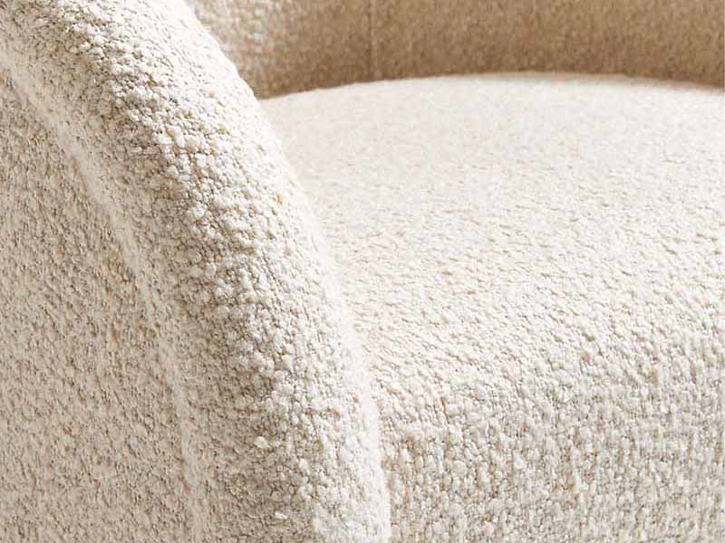 Sophisticated and current, our update to the barrel chair surrounds with comforting curves. Our take on this timeless style accentuates the rounded silhouette with padded channeling that flows in one continuous curve from arm to back to base and back again. Upholstered in a textured boucle in a light beige color, the tight-cushioned chair offers a substantial seat and low-profile, wrap-around back. The recessed swivel base provides a peek of wood grain finished in light barley brown. Alone or as a pair, our exclusive Medoc swivel chair puts a modern spin on a classic design.