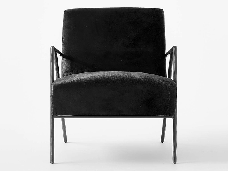 From German designer Jannis Ellenberger, a spotted print lounge chair that manages to perfectly blend modern, traditional and playful details. Black hammered steel arms and legs support cushions upholstered in printed hair on hide