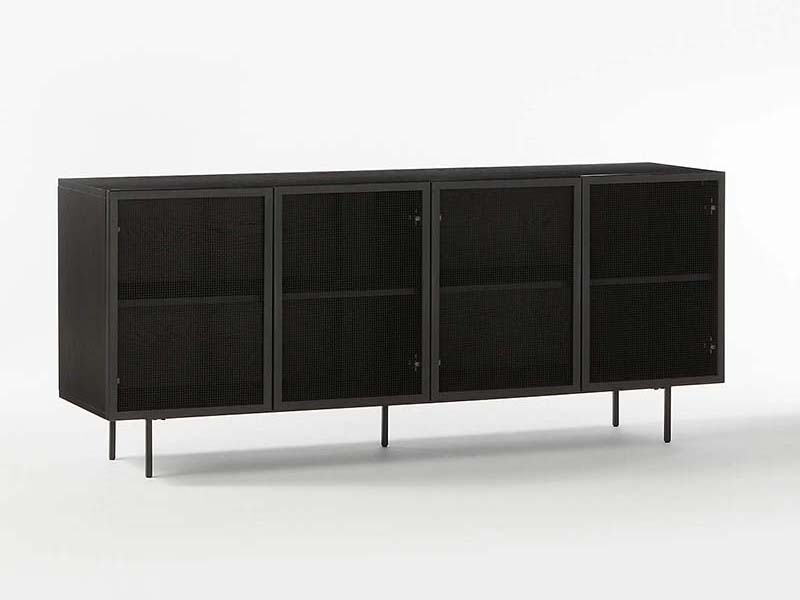 Rich and textured, black mesh doors create a peek-a-boo effect, ideal for concealing media devices without losing remote functionality. Four doors open to two adjustable shelves for plenty of storage. Wire mesh cabinet credenza leaves space behind both inner corners of shelves for media cords to snake down and out the back of the piece.
