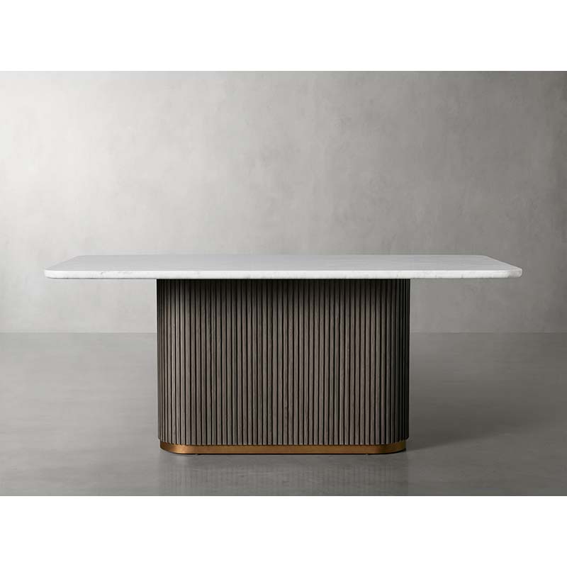 Craftsman-built pieces are constructed from oak veneers, and Carrara marble or bluestone tops, featuring reinforced mortise-and-tenon joinery for added strength and stability.